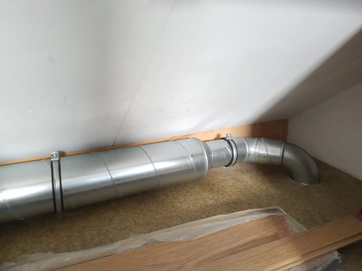 Zo had ik in vrij korte tijd een werkende route van de aanzuigbuis door het dak Ø125mm --> ITHO fan, voor 55 euro van Marktplaats --> met een verloopje naar Ø150mm tot de slaapkamer op zolder waar ik een inblaasventiel van Ø150mm had toegepast. Lekker dikke buizen om de luchtsnelheid te beperken en dus minder herrie. Grotendeels metalen spirobuizen, en her en der wat geïsoleerde/geluiddempende ventilatie slangen. De WTW had ik nog even niet aangesloten, omdat die nog gemaakt moest worden. Ook het gat naar de 1e verdieping was nog even uitgesteld, eerst maar eens kijken of het allemaal werkt.